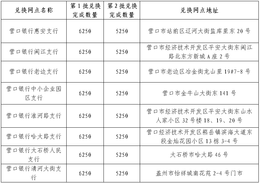 為紀(jì)念中國(guó)人民抗日戰(zhàn)爭(zhēng)暨世界反法西斯戰(zhàn)爭(zhēng)勝利70周年,按照中國(guó)人民銀行工作部署,營(yíng)口銀行于2015年10月12至13日和10月29至30日分2批次面向公眾辦理“中國(guó)人民抗日戰(zhàn)爭(zhēng)暨世界反法西斯戰(zhàn)爭(zhēng)勝利70周年紀(jì)念幣”兌換業(yè)務(wù),現(xiàn)將各兌換網(wǎng)點(diǎn)兌換完成情況公告如下: